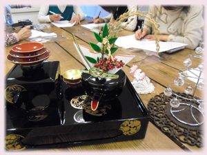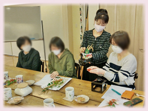 | 受講生の声 本日のレッスンは、不器用な私ですがとても楽しく学べました。屠蘇飾りも素敵に出来上がりとても嬉しく思います。屠蘇器の扱いもとても勉強になりました。これからも、色々なことを学び身に付けていきたいと思います。ありがとうございました。 レッスンを受講するようになって行事の意味などを考えるようになりました。いつも笑顔で美しい先生にお会いできることを楽しみにしています。年齢を重ねていても知らない事ばかりで恥ずかしい限りですが、来年も宜しくお願いいたします。本日もありがとうございました。 疑問に思っても、なんとなく過ごしてきた行事や振る舞いなど…レッスンでしっかり学ぶことができることが有難いです。先生に会うと「自分磨きしなきゃ!」とスッチが入ります。学んだことを活かし、自然にできるようになりたいです。今年もお世話になりました。来年も宜しくお願いいたします。 |