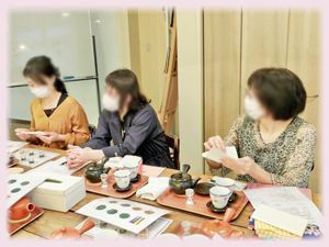 | 受講生の声 毎回、大変勉強になりありがとうございます。現在はペットボトルのお茶を飲む方が多くなっており、本日指導してくださった事を、まずは家族から美味しいお茶を淹れます。同じ茶葉でも淹れ方で違うこ事を強く感じる事が出来ました。ありがとうございました。 ・毎日お茶をいただいていますが、一人あたり何グラムなどを気にしたことなどありませんでした。本日淹れたお茶は、本当に美味しかったので、茶葉の量、お湯の温度、時間などを意識して淹れたら、美味しいお茶がいただけるということを実感いたしました。色々な作法も教えていただき、勉強になりました。ありがとうございました。 ・大好きな緑茶なのに、ずっと自己流でした。淹れ方を守ることで甘くスッキリとした煎茶をおいただく事ができ、勉強してよかったと思いました。また、お作法も初めてのことばかりで、頭の中がいっぱいです。繰り返すことが大事ですので、時間を作って続けていきたいです。ありがとうございました。 |