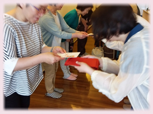 | 受講生の声 本日、大変勉強になりありがとうございました。行事の意味が少し分かりました。特に返し折りをいつも迷っていましたが、本日ご指導くださいましたので、これからは自信をもって行うことができます。次回もご指導をよろしくお願いいたします。 年中行事の秋冬編。三方に関するもの等、また新しい知識が増えました。春夏編、お正月の迎え方等のレッスンで教えていただきたことの復習も合わせて、何度も学ばないと忘れてしまうものですね。本日もチャーミングな先生のご講義を楽しく学ばせていただきました。ありがとうございました。 五節句をまた復習することができ良かったです。季節を感じながら室礼をしたり、着物を着てお祝いをすることは大切な事なので、何度でみ学びたいと思いました。本日もありがとうございました。 |